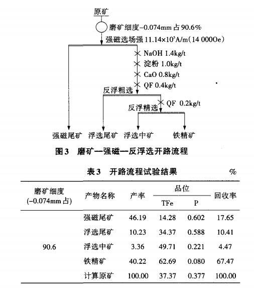 (2)采用磨礦—強(qiáng)磁—反浮選處理該礦石是較為合理的工藝流程。可得品位62.10%、回收率72.20%的鐵精礦。