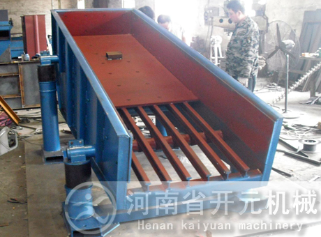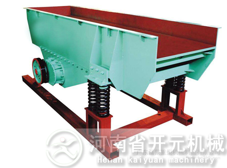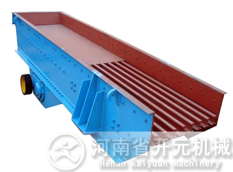 槽式給料機又稱往復式或擺動式給料機,它是貯礦槽排料應用較早的一種給料設(shè)備。型式較多,其結(jié)構(gòu)的共同點是均裝有可控制料層高度的調(diào)節(jié)閘板;在輸料槽下部為一前后移動的給料板。其不同點是給料板角度不一樣,一般為沿卸料方向向下傾斜5度以及更大的傾角(小于物料的靜堆積角)和角度為零的水平型等。給料板的動作有前后往復移動式,抖動式以及擺動式等。傳動機構(gòu)均為曲柄回轉(zhuǎn)式。